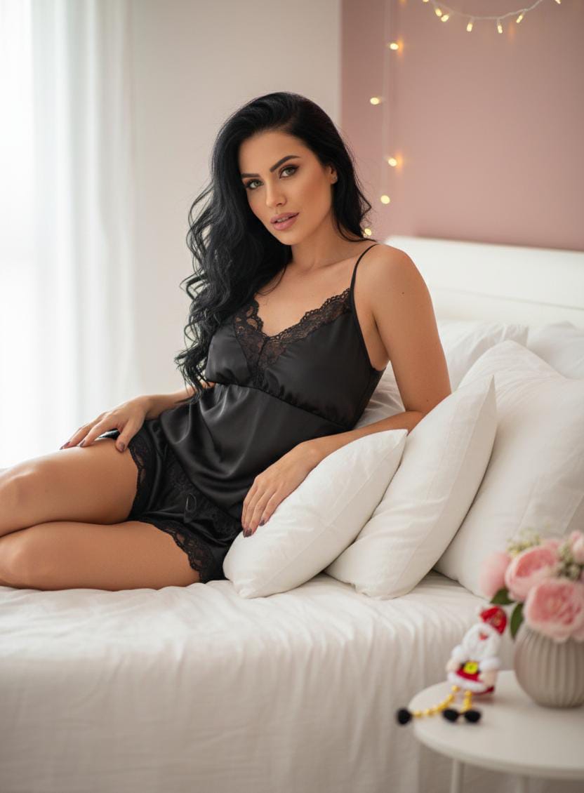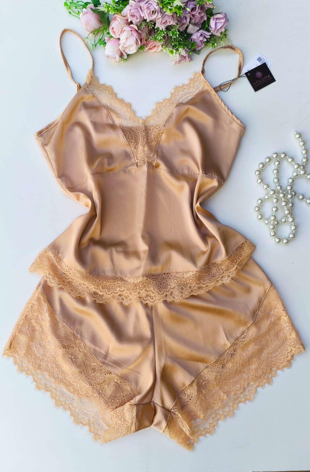 O brilho do cetim encontra o luxo dos reguladores banhados a ouro, criando um baby doll que transforma qualquer noite em um momento especial.