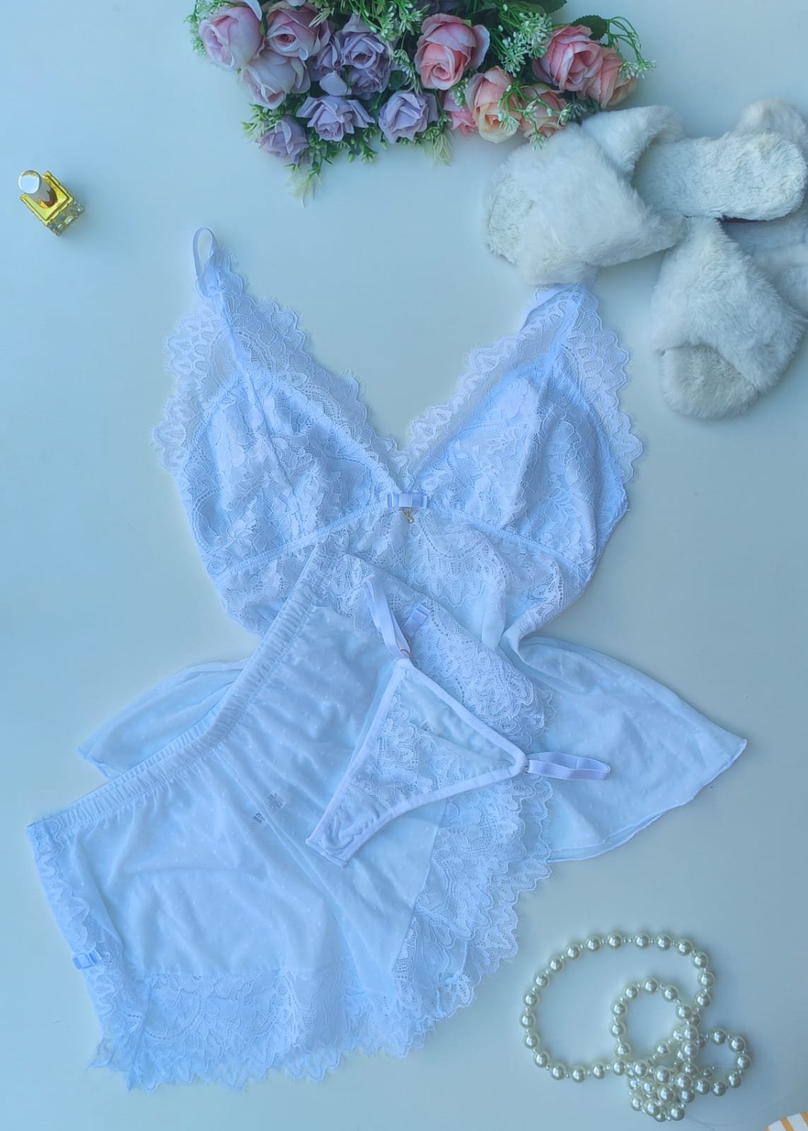 O short em tule de poá conta com detalhes em renda e abertura nas laterais, trazendo um toque moderno e sensual ao conjunto, além de garantir leveza e conforto ao vestir.