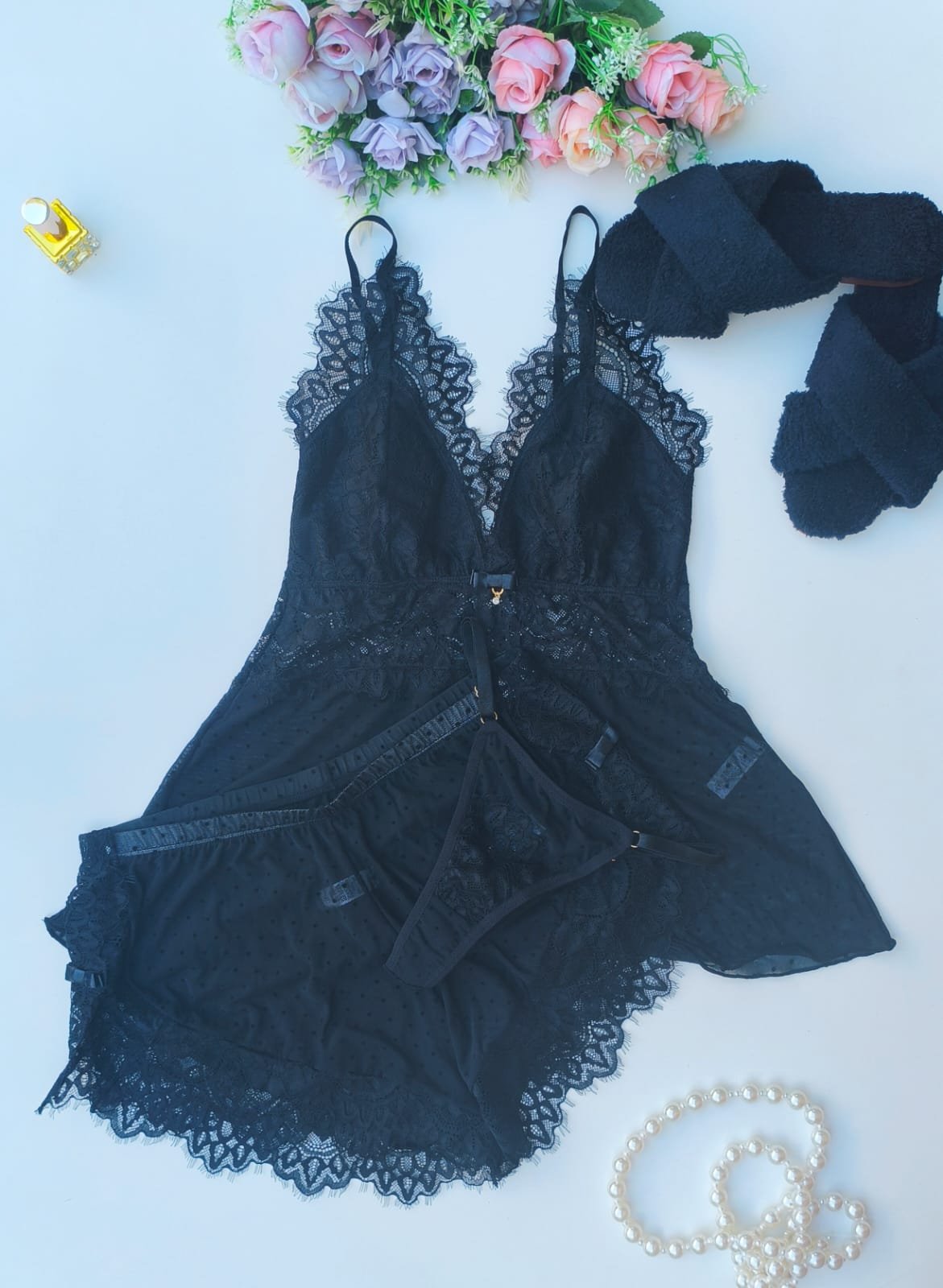 Acompanha calcinha com regulagem lateral, confeccionada em tule de poá e renda, que se ajusta perfeitamente ao corpo, valorizando as curvas com charme e conforto.