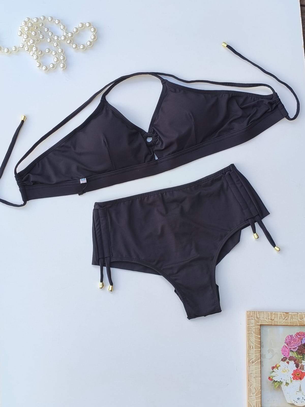 A calcinha de cintura alta modela a silhueta e conta com amarrações laterais que permitem ajuste perfeito, garantindo um caimento impecável em diferentes tipos de corpo.