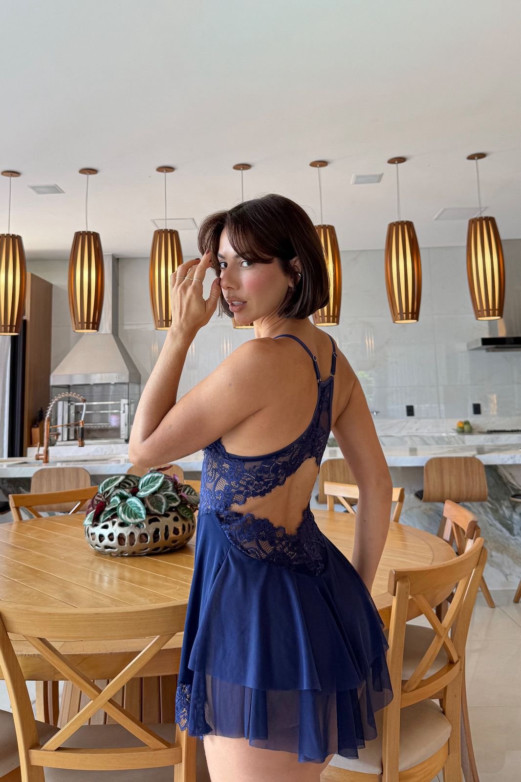 O modelo possui busto em renda delicada, destacando o colo com charme e sofisticação. Nas costas, o grande diferencial é o decote rendado, que deixa a peça ainda mais elegante e sensual.