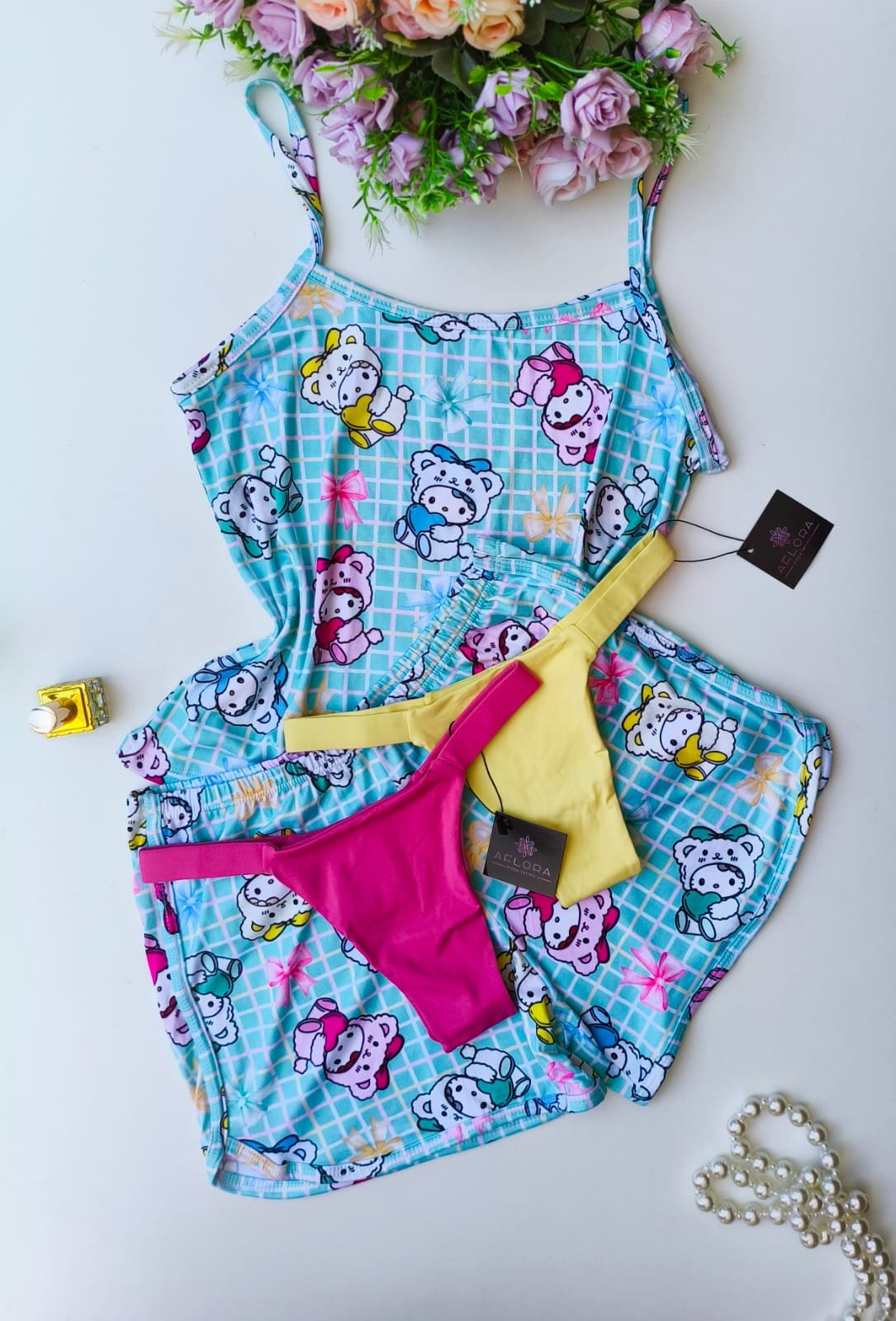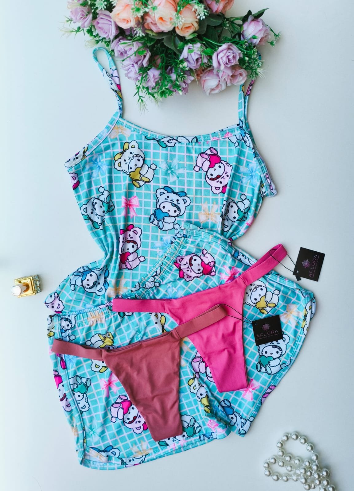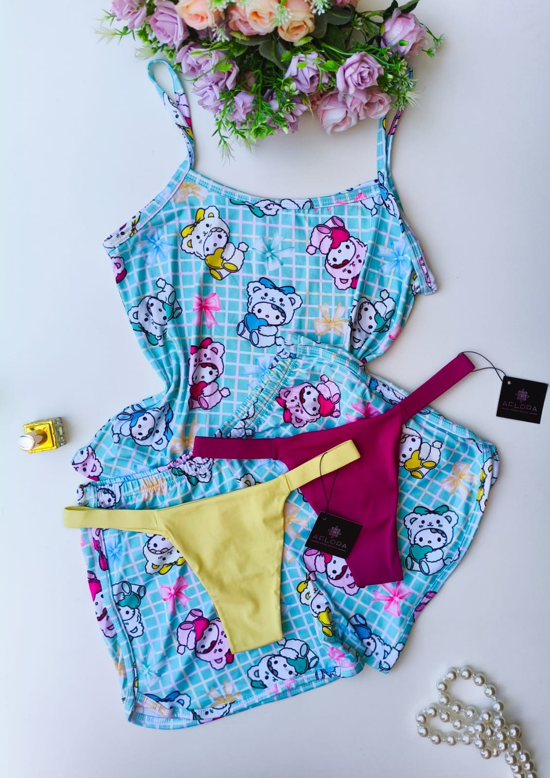 Ele acompanha um pijama em suede, com estampa encantadora e toque macio, perfeito para noites leves e aconchegantes.