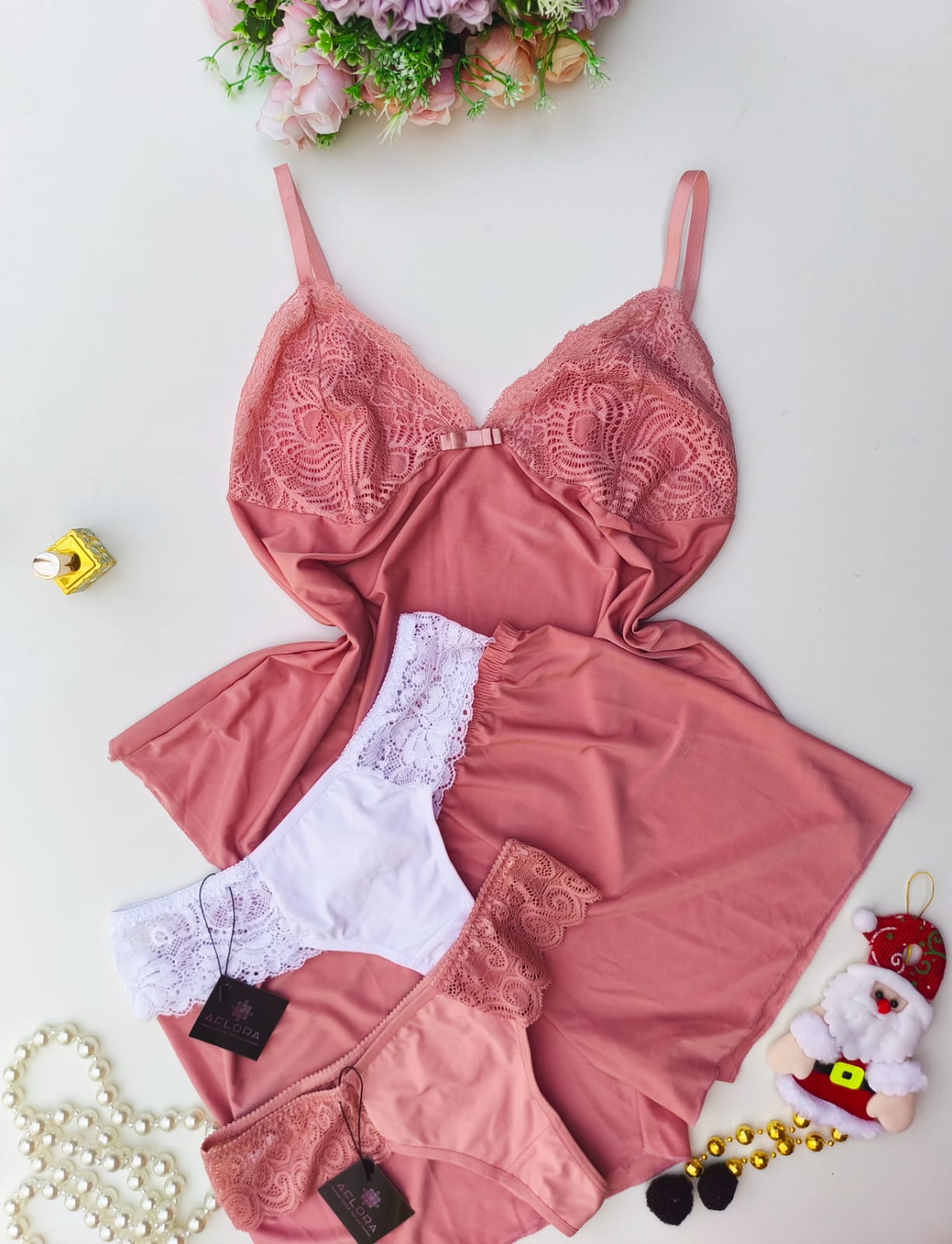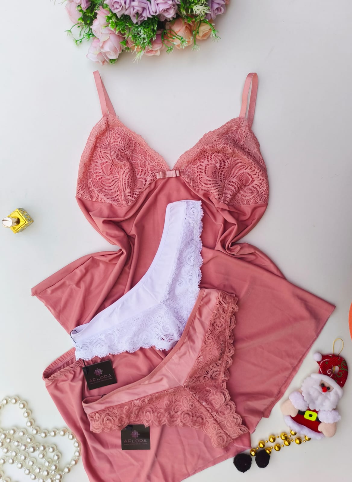 • 2 calcinhas em microfibra com renda (modelo pode variar, cor mantém a proposta: rosé + branco)