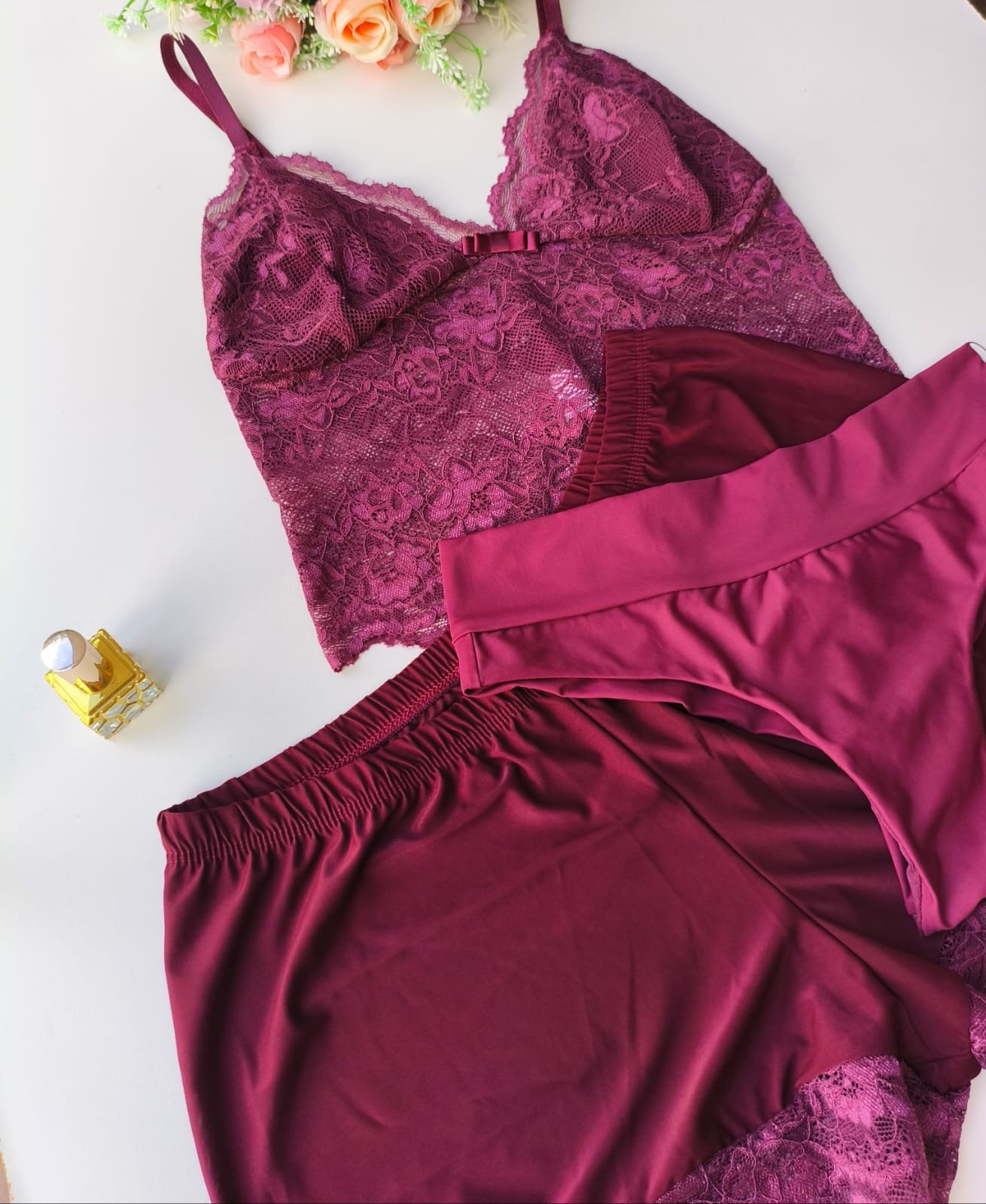 Ele traz 1 baby doll cropped em liganete e renda, super leve e confortável,