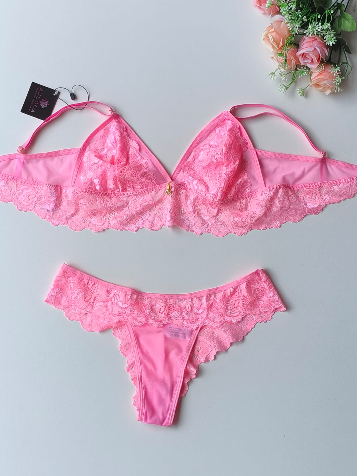 Delicadeza e romantismo em cada detalhe — o conjunto Amor de Flor é feito em tule e renda floral com toque macio e acabamento impecável. O sutiã sem bojo realça o formato natural dos seios, com alcinhas duplas e detalhe dourado central que traz um charme sofisticado. A calcinha estilo fio com renda nas laterais valoriza o corpo com conforto e sensualidade.