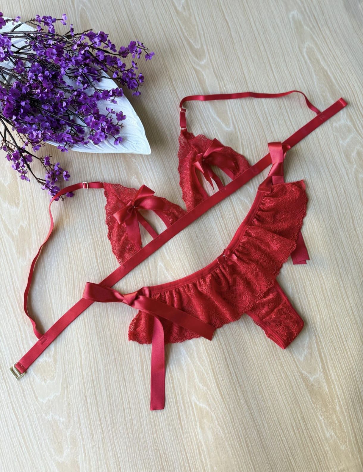 Um conjunto ultra sexy feito para valorizar cada detalhe! O sutiã com abertura nos seios vem com tiras delicadas e lacinhos, criando um visual ousado e cheio de charme. A calcinha com fitas laterais ajustáveis se adapta perfeitamente ao corpo, enquanto os babadinhos em renda trazem um toque delicado e feminino.