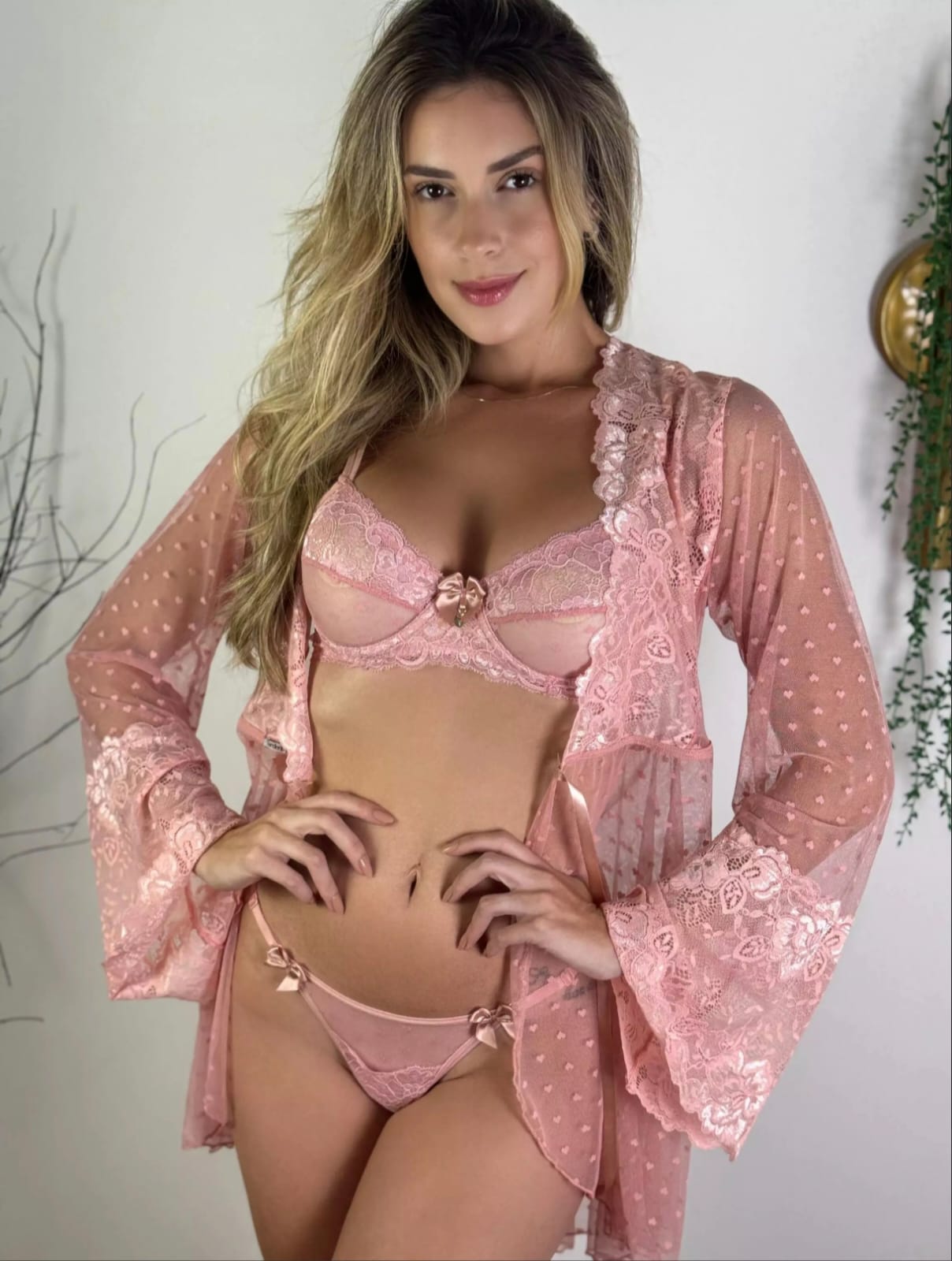 Puro charme e delicadeza! O Conjunto Thiffany é confeccionado em meia taça sem bojo, valorizando o busto de forma natural e elegante. Produzido em tule poá combinado à renda floral, transmite leveza e sensualidade em cada detalhe.