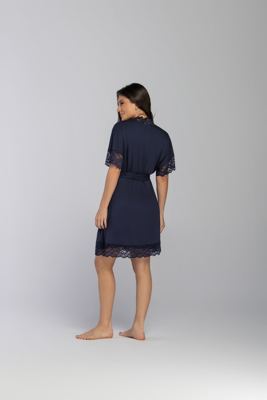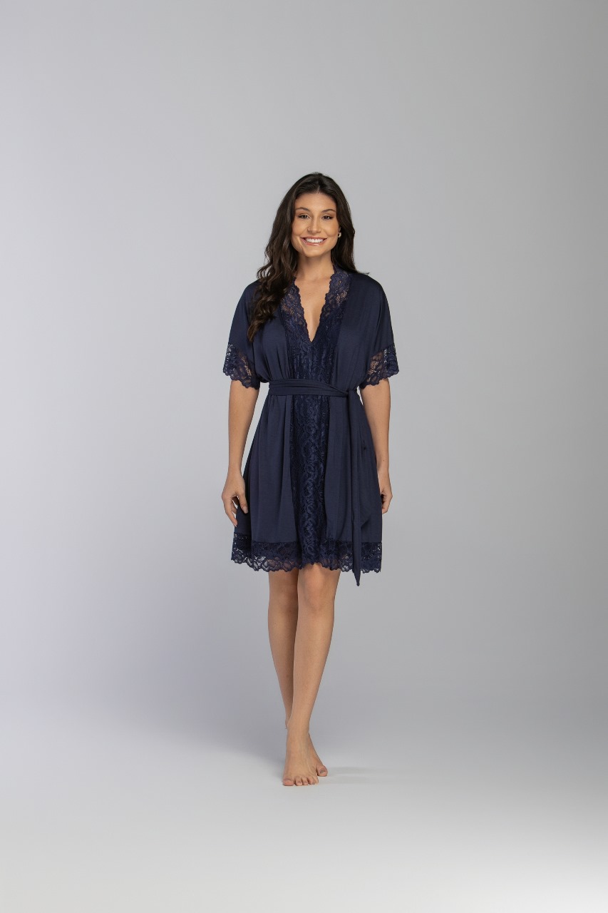 As mangas morcego trazem movimento e modernidade ao visual, enquanto a renda delicada adiciona um toque romântico e feminino nos detalhes, realçando a beleza da peça com sutileza.
