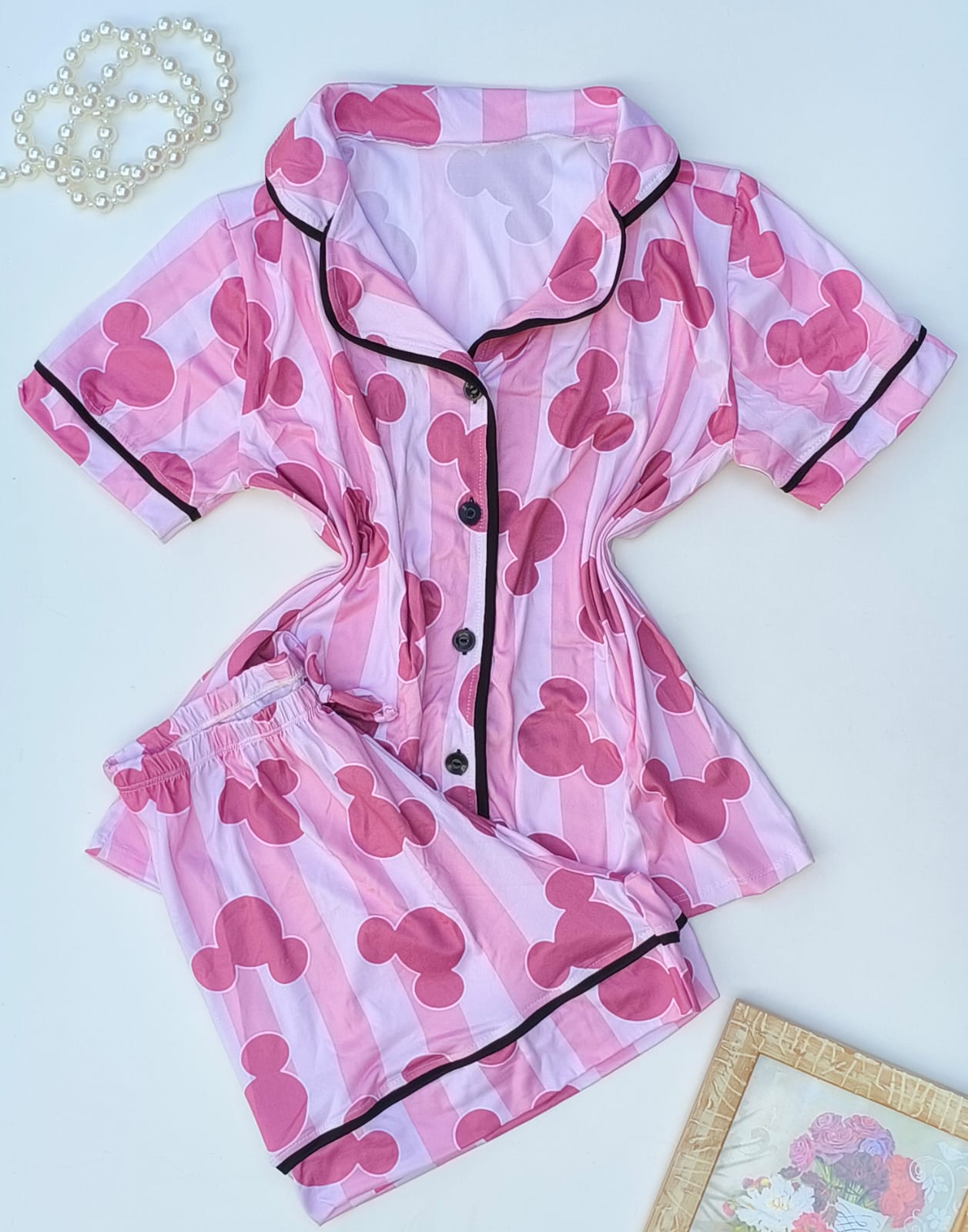 O Pijama Americano Minnie Dream é aquele modelo que une conforto, fofura e um toque de elegância que só a AFlora tem 💕. Confeccionado em suede leve e macio, ele possui estampa exclusiva em tons de rosa com o clássico desenho de orelhinhas — um charme irresistível! A modelagem americana, com botões frontais, gola delicada e acabamento em viés preto, traz aquele ar sofisticado e atemporal.